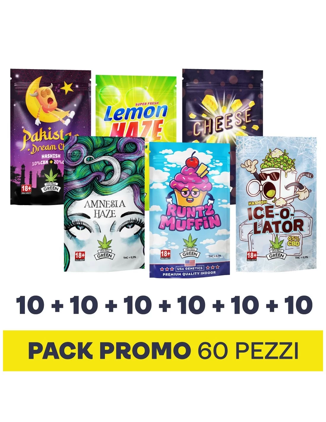 Promo Pack 6 CBD varieties between flower and hashish for a total of 60 pieces. We have selected our Best Sellers and discounted them for you.