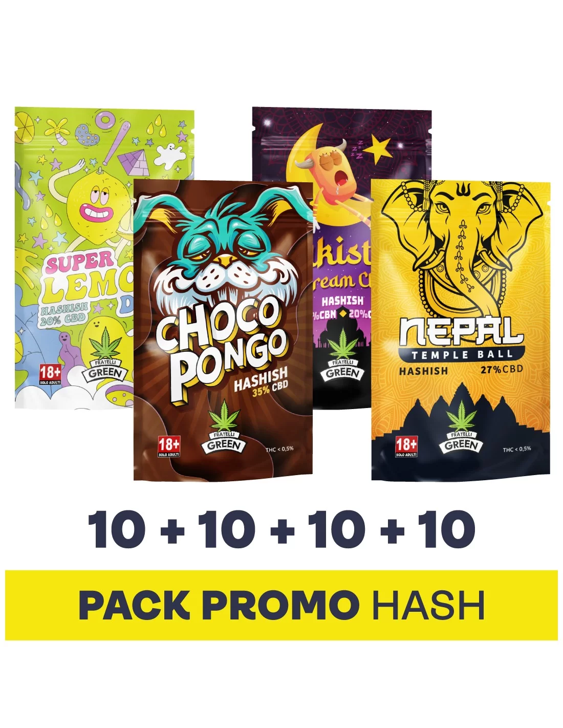 Pack promotionnel 4 variétés de haschich CBD pour un total de 40 pièces. Nous avons sélectionné nos meilleures ventes et les avons remises pour vous.