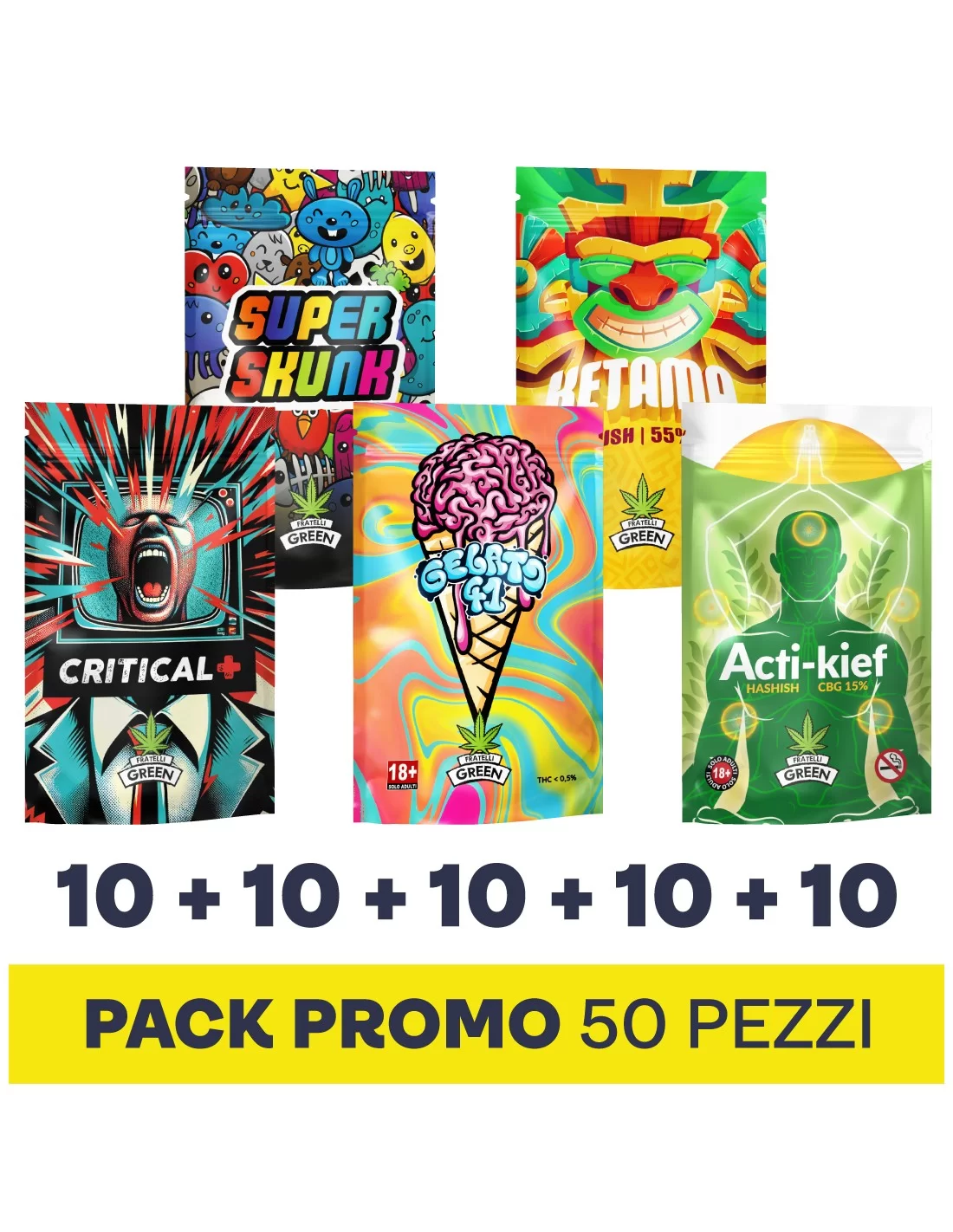 Promo Pack 5 Varietà CBD tra fiori ed hash per un totale di 50 pezzi. Abbiamo selezionato i nostri Best Seller e li abbiamo scontati per te.